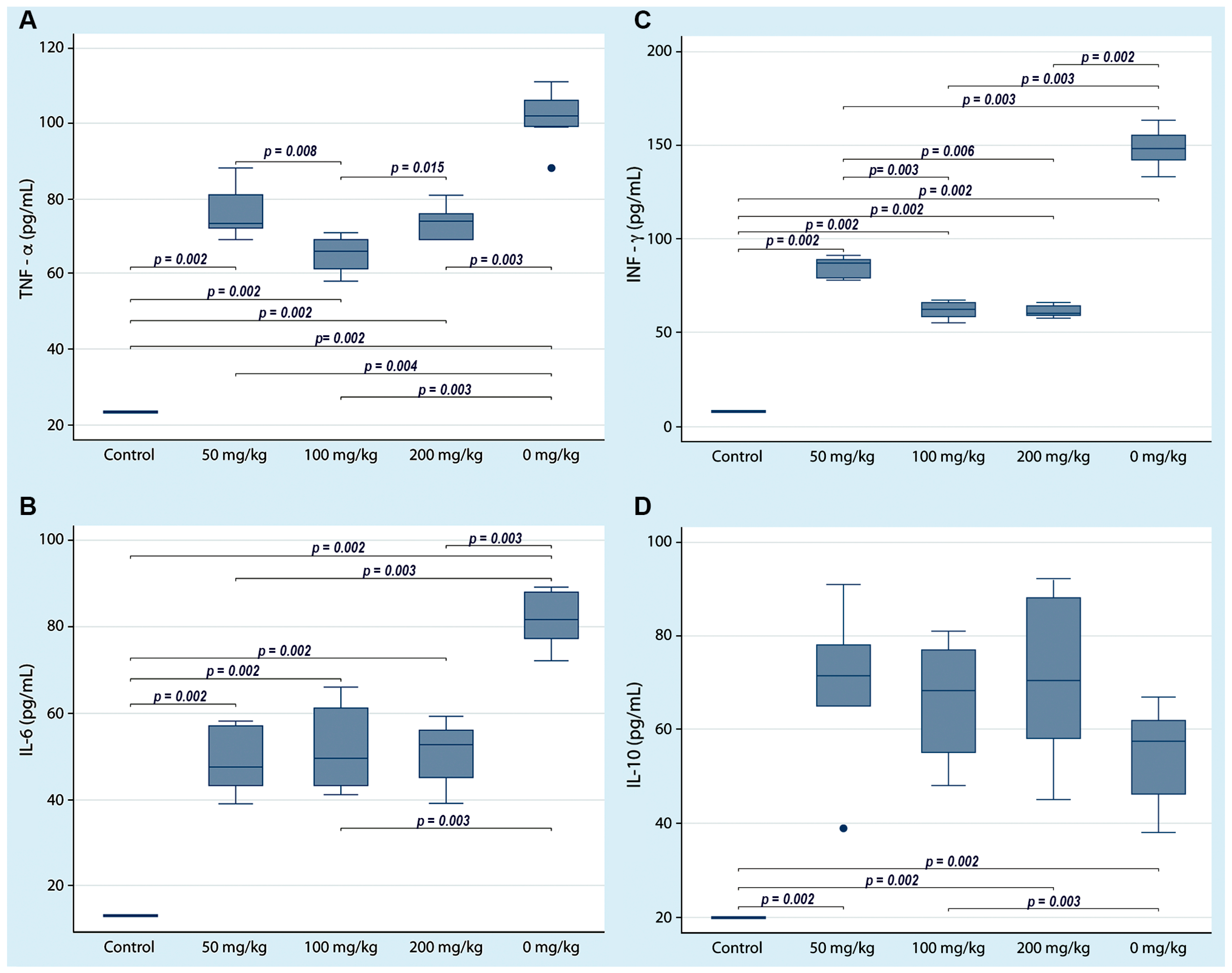 | TNF-α (pg/mL) | INF-γ (pg/mL) | IL-6 (pg/mL) | IL-10 (pg/mL) | |