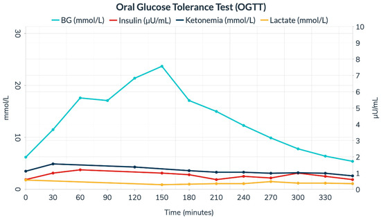 Figure 1). Interestingly, after 3 h, a progressive decline in BG levels was observed without a contextual insulin increase. Normal lactate levels throughout the hyperglycemic phase definitively exclude GSD-0.