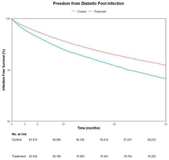 The primary outcome was diabetic foot ulcer infection, and the secondary outcome was major amputation, identified via ICD-9 procedure codes 84.10, 84.13–84.17, 84.3, and Current Procedural Terminology (CPT) codes 27590-92, 27594, 27596, 27598, 27880-82, 27884.