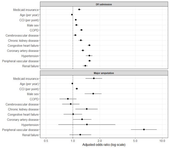 In multivariable logistic regression, Medicaid beneficiaries with DFUs had higher odds of DFI hospitalization within 12 months (aOR 1.18, 95% CI 1.14–1.24, p < 0.001) (Table 3). Other independent predictors included higher CCI (aOR 1.08 per point, 95% CI 1.07–1.09, p < 0.001), male sex (aOR 1.10, 95% CI 1.06–1.15, p < 0.001), COPD (aOR 1.25, 95% CI 1.20–1.30, p < 0.001), chronic kidney disease (aOR 1.23, 95% CI 1.16–1.30, p < 0.001), congestive heart failure (aOR 1.53, 95% CI 1.46–1.59, p < 0.001), coronary artery disease (aOR 1.30, 95% CI 1.24–1.35, p < 0.001), hypertension (aOR 1.53, 95% CI 1.40–1.66, p < 0.001), peripheral vascular disease (aOR 1.54, 95% CI 1.48–1.61, p < 0.001), and renal failure (aOR 1.38, 95% CI 1.30–1.46, p < 0.001) (Figure 3). Older age was associated with lower odds of DFI hospitalization (aOR 0.98 per year, 95% CI 0.98–0.98, p < 0.001).