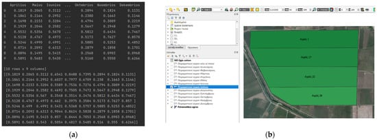 (a) Testing results by trained machine learning algorithm; (b) Input for the unknown crop’s NDVI values and identification prediction.