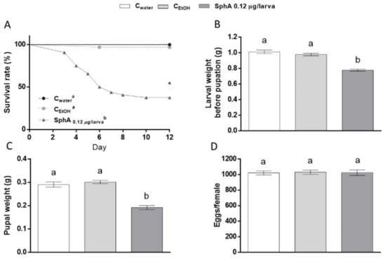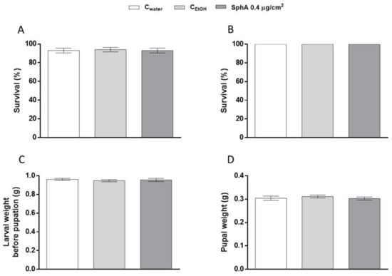 Topical application of SphA did not affect the survival rate of both 2nd (Log-Rank test: p = 0.9437) (Figure 2A) and 5th instar larvae (100% survival) (Figure 2B). These latter achieved the same weight before pupation (One Way ANOVA. p = 0.7536) (Figure 2C) and when they attained the pupal stage (One Way ANOVA: p = 0.6772) (Figure 2D).