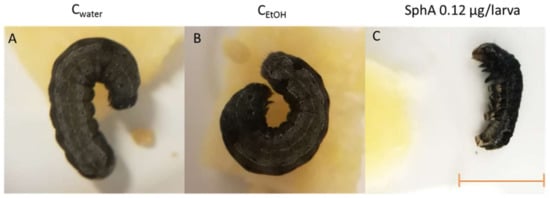 Alteration of S. littoralis larval development following oral administration of SphA. Larvae treated with SphA for three days showed a clear reduction of vitality and body size (C) No difference in the larval head capsule size indicates that all the larvae are in the same instar. compared to control larvae treated with water (A) or EtOH 50% (B). Scale bar, 0.5 cm.