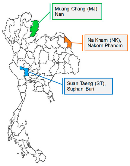 At the community level, purposive sampling was used, focusing on farmers who have grown rice in three sub-districts from three provinces: (1) Muang Chang (MJ) sub-district of Nan province, (2) Suan Taeng (ST) sub-district of Suphan Buri province, and (3) Na Kham (NK) sub-district of Nakorn Phanom province) Study sites for MJ, ST and NK are located in the North, Central and Northeast regions of Thailand, respectively (Figure 2). MJ and NK represented the major rice cultivation areas that were grown in the rain-fed areas, whereas ST represented the irrigated rice cultivation areas.