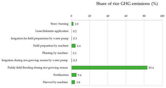 Approximately 90% of the world’s rice production is grown in Asia [6]. Rice fields and several activities in rice cultivation processes are a source of greenhouse gas (GHG) emissions. Field activities such as rice straw burning, field preparation by tractor, irrigation by water pump, planting by machine, flooding during the rice growing season, fertilization, and harvest by machine all contribute to climate change through GHG emissions [7]. The field burning of rice straw pollutes the air and also emits methane (CH4) and nitrous oxide (N2O) [8]. In terms of carbon dioxide (CO2) emissions, the main sources are the activities and the operation of agricultural machines use energy for tillage, transplanting, sowing, irrigation pumping and harvesting [9]. Conventional rice cultivation in a flooded field emits CH4 through organic matter decomposition by methanogenic bacteria under anaerobic soil conditions [10]. Moreover, the application of nitrogen (N) fertilizer is the main source for N2O emissions [11].