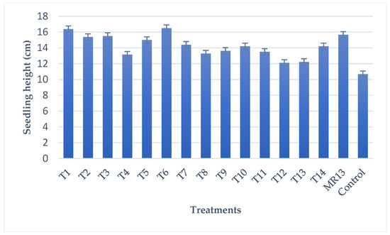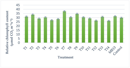 Chilli seeds were pre-germinated in sterile water and transferred into a seedling tray filled with peat moss. It was left to grow for about one week or until 2–4 leaves emerged from the seedlings. Then, 2 mL of the moringa leaf extract (T1–T14), MR13 (endophytic bacteria) and distilled water (control) were applied to the peat moss. Every treatment was applied once every two weeks with five replications. Thirty days after seed germination, the seedlings were subjected to plant physiology analyses such as seedling height, total root length, total root surface area, relative chlorophyll content and root shoot ratio.