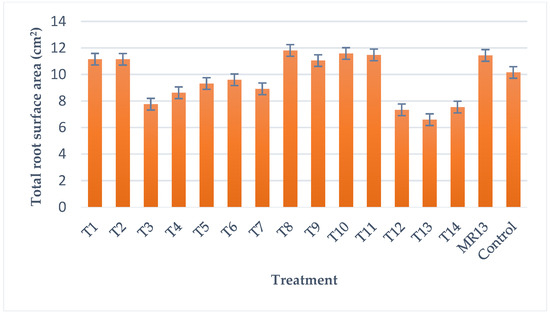 Total root surface area of chilli seedlings treated with endophytic bacteria and moringa leaf extract using various extraction methods. The values are an average of five independent measurements.