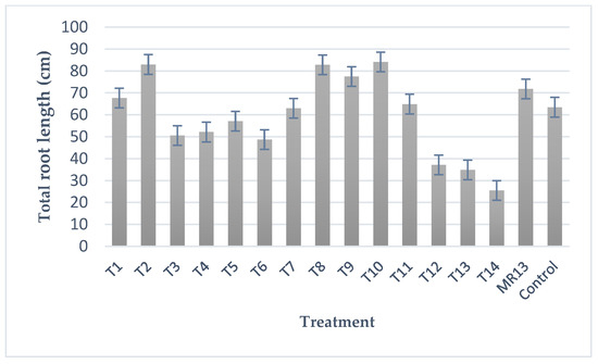 The root length of chilli seedlings treated with endophytic bacteria and moringa leaf extract using various extraction methods. The values are an average of five independent measurements.