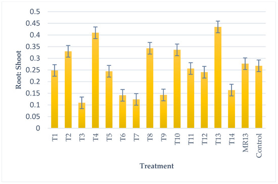 The root to shoot ratio of chilli seedlings treated with endophytic bacteria and moringa leaf extract using various extraction methods. The values are an average of five independent measurements.