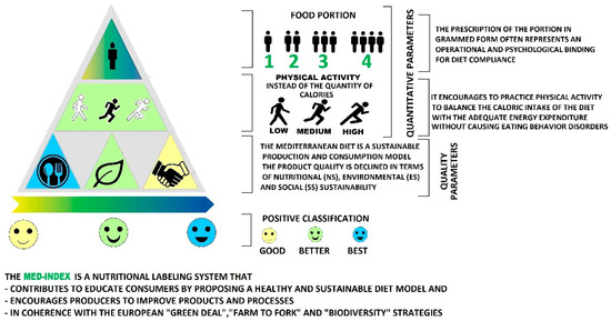 The Mediterranean diet and the correct adoption of the Med-Index can support a resilient and sustainable community model. Nutritional labeling should not only have the scope of satisfying the consumer needs about nutritional information, but also a tool to compare different products with the aim of assessing which is the most sustainable, because human health is inextricably linked to health of the planet [11].