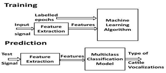 In agriculture, at present, there is a growing focus on livestock monitoring for smart farms. Various research works have been published in related contexts, such as animal welfare and disease detection. In [2], a deep-learning-based method was recently proposed for classification of cattle vocalization for real-time livestock monitoring. The proposed scheme consists of a 2D CNN (convolutional neural network) to classify cattle vocals as well as remove background noise using STFT, and another CNN for behavior classification from the existing datasets, achieving an overall accuracy of 81.96% using MFCC features. The work in [3] dealt with classification of cattle cough sounds using a total of 205 min of sounds resulting in 285 labelled calf coughs. The extracted features are obtained by calculating the FFT of the input audio, removing the background noise and reducing the resolution in the spectrograms by summing the frequencies into 12 separate bands and considering duration of the cough. An example-based classifier is then used based on the Euclidean distance between the two rough spectrograms of the input audio data and the labelled data. The lower the distance, the more it resembled its corresponding spectrogram providing 98% specificity rate (true negatives) and 52% sensitivity rate (true positive). Despite the low sensitivity, the method is still able to identify increased periods of coughing, allowing farmers to administer treatment for the respiratory disorder. In [4], the feeding behaviour of the cattle was studied using cattle grazing sounds by attaching microphones and cameras to a cow’s forehead and exposing the cattle to different treatments which various plant species, at two different heights, an increasing of herbage mass, and the number of bites it takes to finish (10–30). The sounds were analyzed by extracting the energy flux density from the sounds and it is found that energy flux density relates linearly to the dry matter intake. A non-human animals positive and negative emotions monitoring scheme was reported in [5] for goats using emotion-linked vocalizations based on behavioural(looking) and physiological(cardiac) measures. It was found that during the habituation phase, goats gradually reduced the duration of looking towards the sound source, and the heart rate also decreased, suggesting that habituation to the valence of the stimuli occurred. Later, the occurrences of looking and heart-rate increased immediately after the second call, and decreased during rehabituation, suggesting that goats perceived the change in call valence. In [6], a cattle call monitor (CCM) system was developed using cattle vocalizations for automatic estrus detection. By matching the information of zero-crossing (>5), frequency range (50–2000 Hz), and duration (0.5–10 s) of the windowed signals from the structure-borne and airborne sound microphones, the proposed algorithm is able to identify the estrus calls providing detection with sensitivity of 87% and specificity of 94%. Another work was published in [7] on estrus detection for dairy cattle by monitoring cattle vocalization based on vocalization rate (calls/hr) and the rate of harmonic moo and nonharmonic (noisy) bellow calls for the complete vocalizations.