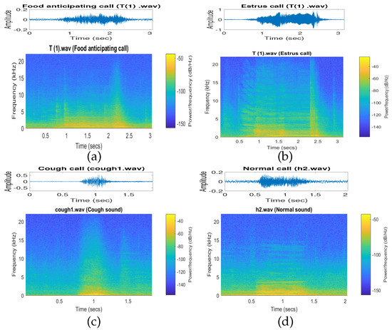 Illustrative spectrogram plots for various cattle vocal samples referring to (a) food anticipation call, (b) estrus call, (c) cough sound, (d) normal call.