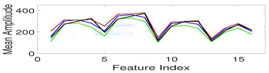 To reduce the redundancy while maintaining the variability of the contextual features, the decimated version of the feature set is considered to be a kind of feature selection. A decimation factor of 8 is used here which reduces the length of the features from 128 to 16. For illustration the average of all the (16 × 1) features for each types of cattle vocals are plotted in Figure 3.