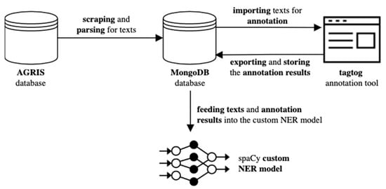 For assembling our corpus of agricultural texts, the AGRIS database was scraped and the retrieved HTML parsed to extract content from it. A Python script was used to submit a search query to the AGRIS database by specifying query parameters like the subject and language of the search results, as well as the range of text publication dates. To build our query, “agriculture” was specified as our texts’ subject and “English” as their language. The range of text publication years was set from 2000 to 2021. The webpages were parsed to extract the text and some metadata. The texts were pre-processed to remove any URLs and HTML tags still remaining in them, and stored into a MongoDB (https://www.mongodb.com/ (accessed on 2 December 2021)) database. Each text was then imported into tagtog (https://tagtog.net/ (accessed on 4 December 2021)), the tool used for the annotation of the texts by a team of human annotators. The annotation results (available in JSON and TSV formats) were also stored into the MongoDB database by updating the respective records. The texts and their annotations were used to feed into our custom NER model.