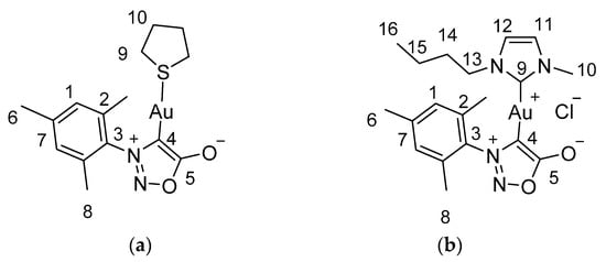 Gold has been used for therapeutic or catalytic purposes for decades [6,7,8,9]. The current concern is to achieve higher stability of the compounds that carry metals, for which the coordination with N-heterocyclic carbene (NHC) ligands has been an excellent strategy [10]. Seeking new ligands that could stabilize and modify the complexes’ properties, sydnones result as an interesting option as they are adequate starting materials for NHC generation.