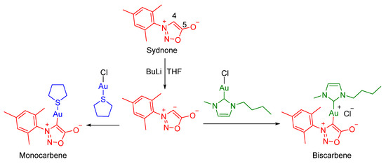 Two gold(I) complexes have been synthesized by a two-step reaction. The first reaction step was the deprotonation with butyllithium to obtain the corresponding NHC. In the second reaction step, the metal precursor was added to afford the corresponding gold complex. At this point, the complex obtained depends on the nature of the metal precursor. A monocarbene complex (sydnone-Au-tht) was obtained using [Au(tht)Cl] as the metal precursor and a biscarbene complex (sydnone-Au-imidazolium) was obtained using a gold imidazolium complex as the metal precursor instead. The 13C-NMR resonance frequencies of the carbene carbon atom shifted to higher values from 97.3 to 135.6–139.7 ppm, mono and biscarbene, respectively.