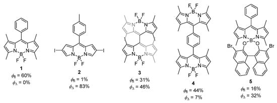 Recently, other strategies have started being developed that avoid the use of heavy atoms, having the advantage of the possibility of balancing fluorescence and TS population. One of these strategies is the construction of orthogonal BODIPY dimers, in which the BODIPY chromophores are directly bonded, a process first reported by Akkaya and col. (3 in Figure 1, with ϕfl (CHCl3) 31% and ϕΔ (DCM) 46%) [], although the synthesis of these dimers is usually tedious. Related to this, in 2017, Shao, Huang, and Dong [], and Wu, Song, and Kuang [] separately reported a dimer with two identical BODIPY units linked through their meso-position via a p-phenylene bridge (4 in Figure 1), whose synthesis is easier than that of the orthogonal dimers. This dimer also showed PS-TS capability, although significantly lower than the previous orthogonal one (ϕfl (DCM) 44% and ϕΔ (DCM) 7%) [,].