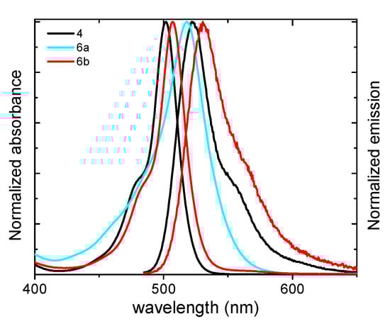Height-normalized absorption and emission spectra of meso-p-phenylene-bridged BODIPY dimers 4, 6a, and 6b in chloroform (3 × 10−6 M).