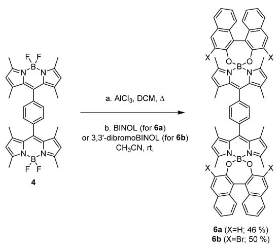 The synthesis of compounds 6 was carried out following the methodology developed by us for the synthesis of BINOL-O-BODIPYs from corresponding F-BODIPYs, based on the substitution of the fluorine atoms by the oxygens of the BINOL moiety (BINOL for 6a; 3,3′-dibromoBINOL for 6b) activated by a Lewis acid, in this case, AlCl3 []. The two compounds were successfully obtained in 46 and 50% yields, respectively, from parent F-BODIPY dimer 4 [,] (Scheme 1).