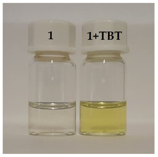 The chemosensory ability of the new thiosemicarbazone 1 was studied in the presence of TBT. To an ACN solution of the compound (1 mL, 10−4 M), 50 equivalents of TBT (50 µL, 10−1 M) were added. The optical response was analyzed by visual inspection and in a UV-vis chamber under ultraviolet light at 312 nm. A color change from colorless to yellow was observed (see Figure 1). No changes in fluorescence were found.
