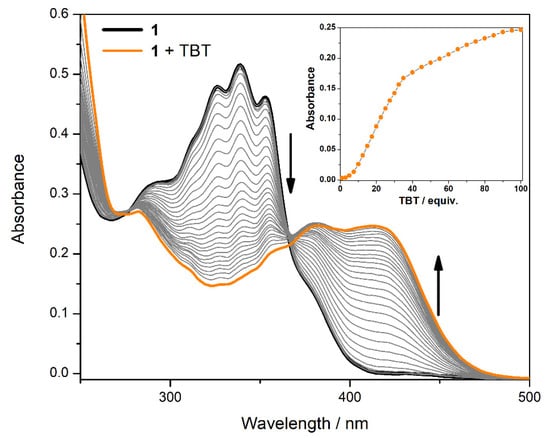 A spectrophotometric titration was performed to assess the number of equivalents necessary to reach the maximum optical signal (see Figure 2). A sequential addition of a TBT solution (10−2 M) to an ACN solution of the compound (10−5 M) was conducted and the absorbance spectra were collected. It was observed that 100 equivalents were necessary to reach the absorbance plateau. However, the addition of 1 equivalent (10 µM) was enough to detect a change in the optical signal, showing this compound has a large range of concentrations in which TBT can be detected.