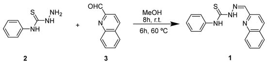 The synthesis of the new thiosemicarbazone 1 was performed with a mixture of quinoline-2-carboxaldehyde 2 and N-phenylhydrazinecarbothioamide 3 in equal amounts (0.318 mmol). The two precursors were dissolved in MeOH (10 mL) and stirred at room temperature for 8 h. However, TLC analysis showed that the reaction did not progress, so it was stirred for further 6 h at 60 °C. After this time, the pure product 1 was obtained as a brown solid, which was filtered from the cold reaction mixture in 17% yield (Scheme 1). The novel thiosemicarbazone 1 was characterized by 1H NMR.