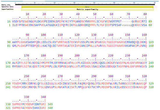 The CDD technique also confirmed the presence of the viral matrix protein at the 17–348 position. The lone member of the superfamily cl02918 is the viral matrix protein (CDD no. pfam00661). A protein superfamily is a group of proteins made up of one or more protein families [46,53,54]. The set of all superfamilies must be a partitioning of the set of all protein sequences or subsequences defined by the protein families’ relationship, and each superfamily must be closed under transitivity [54]. The protein QBQ56721.1 (Figure 1) was predicted to be closely related to the matrix superfamily by the SuperFamily tool (e value of 0.0). Main text paragraph (M_Text).