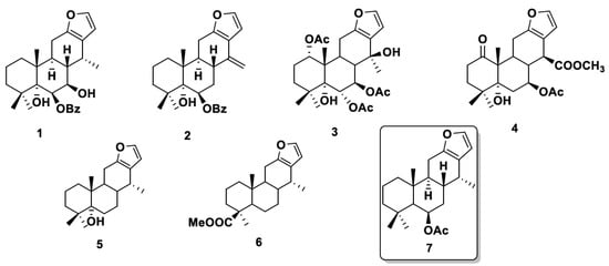 On the other hand, the Caesalpinia genus constitutes a potential source of bioactive natural products due to its more than 205 species distributed throughout the world [], many of which have not yet been investigated for potential pharmacological activity. Several species are endemic to Mexico and exhibit a diversity of biological activities such as cytotoxic, antioxidant, antimalarial, anti-inflammatory, and antiviral []. The Caesalpinia genus is distinguished by the presence of diterpenes, with a vouacapane skeleton, which is characterized by containing a furan ring in its skeletal structure. Some examples of natural products (1–6) isolated from this genus are shown in Figure 1, where 6β-acetoxivouacapane 7 is the natural product under study in this work, and it was isolated from Caesalpinia platyloba [].