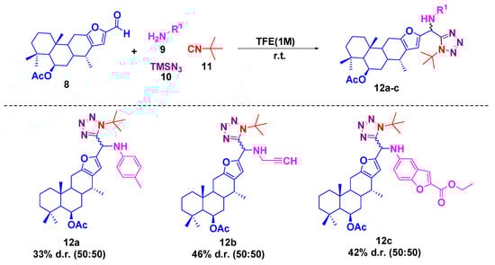 Thus, we started by searching for the optimal reaction conditions for the Ugi-azide reaction using aldehyde-vouacapane 8, p-tolouidine (9) as a model reaction, and tert-butyl isocyanide (11). We first performed the reaction using the classical Ugi-azide conditions [,,], with MeOH as the solvent at room temperature. However, the product could not be identified because the aldehyde-6β-acetoxyvouacapane 8 was not soluble in the reaction mixture, and consequently the starting materials were not consumed (entry 1, Table 1). As a second experiment, we performed the reaction using 2,2,2-trifluroethanol as solvent instead of MeOH because of the fact that, in recent years, Ugi-azide reactions have been carried out successfully using this solvent. The reaction proceeded well, resulting in a product with a 33% yield after purification by chromatographic column (entry 2, Table 1). At this point, it was decided to use these conditions, although there are more reaction conditions to be explored such as the use of the microwave reactor [], sonication [], and the use of Lewis acids such as ZnCl2 []. It is also important to mention that in the Ugi-azide reaction, a stereogenic center is formed, so the product obtained was observed by 1H NMR as a mixture of diastereomers in a 50:50 ratio.