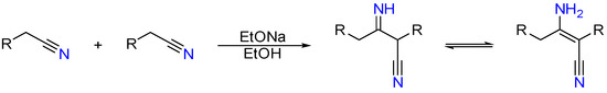 The Thorpe Reaction (Figure 1) was reported in 1904 [1] by the British researcher Sir Jocelyn Thorpe (1872–1940). This reaction is described as a self-condensation of nitriles in the presence of a basic catalyst producing cyanoenamines (β-enaminonitriles). Sir Thorpe realized this reaction using a hot alcoholic dissolution to which was added the nitrile and a catalytic quantity of sodium ethoxide (EtONa). He informed that the product obtained was a cyanoimine [1]. However, posteriorly spectrophotometric studies [2,3] confirmed that cyanoimine tautomerizes rapidly to the corresponding cyanoenamine.