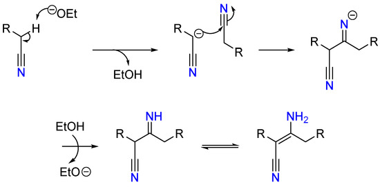 Since its discovery, the mechanism of the Thorpe reaction [5,7,10,11] has been described as ionic and by four steps (Figure 2). Firstly, the deprotonation of the α-hydrogen in the nitrile is promoted because of the basic catalyst. An intermediate carbanion is formed, and it attacks nucleophilically the carbon of a nitrile group in a second molecule, forming the conjugate base of the corresponding imine as an intermediate. Then, a proton exchange occurs that neutralizes the imine and regenerates the catalyst. Finally, tautomerization ensues to form the cyanoenamine. While it has never been clarified how this last step takes place, it is believed that the tautomerization is favored towards the cyanoenamine because it presents a π-conjugated system capable of causing effective electronic delocalization which supplies greater stability compared to cyanoimine.