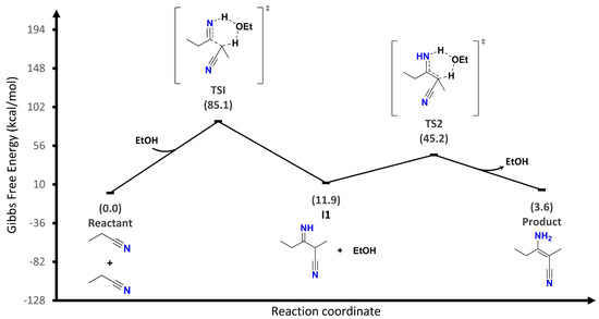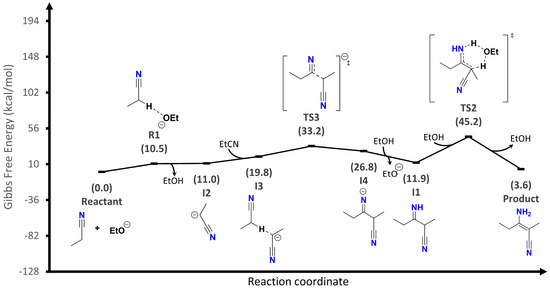 The second proposal (Figure 4) is an ionic reaction mechanism including the alkoxide participation as the catalyst. In this mechanism, before deprotonation, an adduct (R1) is formed between the ethoxide and the α-hydrogen of the nitrile. Then, a carbanion (I2) is immediately produced, which creates a new adduct (I3) with a second nitrile molecule. From this last adduct, the first transition state (TS3) is reached, and the imine anion (I4) is generated. After that, imine (I1) is neutralized, and it is proposed that tautomerization follows the second transition state (TS2), as in the first proposal. Now, the limiting step of the reaction is the TS2 formation whose energy barrier is 45.2 kcal/mol. This is a milder energy value, although it still requires heating for the reaction to result. This proposal shows the importance of the basic catalyst in the reaction, since the determining step energy has decreased by half compared to the first proposed mechanism.