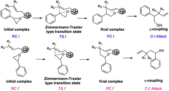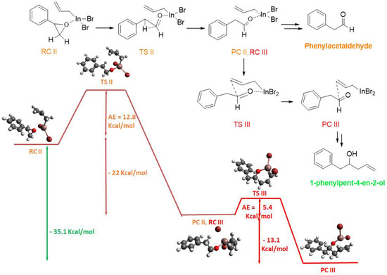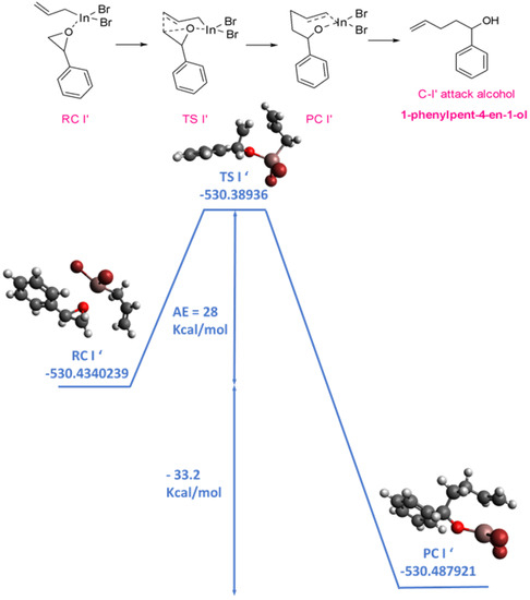 To start with computational modeling studies following the proposed mechanism for the allylation of carbonyl compounds published by our research group [1], as can be seen from Scheme 5, we considered that, at first, the epoxide is adsorbed on the surface of the InNPs of the allyl-In species to give the initial complex (reactive complex—RC). Then, a cyclic Zimmerman–Traxler type transition state (TS) is formed, and the π electrons of the allylic system attack one of the carbon atoms of the epoxide, giving rise to a new C-C bond through a γ-coupling. By the adding of diluted HCl, the double bond of the alkene is regenerated, giving rise to the final product (product complex—PC). Since the epoxide is not symmetric, we can obtain two alcohols from the allylic attack on each of the carbon atoms (C-I and C-I′) of the oxo-cyclic system.