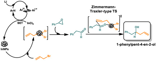 Based on the stoichiometry of the reaction, the experimental observations and DFT studies, we propose a plausible reaction mechanism for the studied transformation. As can be seen from Scheme 9, the InNPs would be obtained from the indium salt by the action of the reducing system; then, the addition of allyl bromide could lead to the formation of an allyl–indium intermediate, which by reaction with the epoxide would give the phenylacetaldehyde. This activated carbonyl compound could give rise to the corresponding homoallylic alcohol through a Zimmerman–Traxler-type transition state.
