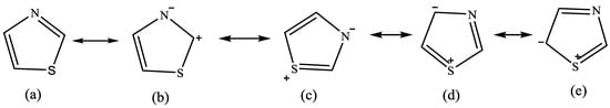 The thiazole resonating structures are shown in this illustration. The Subfigures (a–e) showed movement of electron and displayed that the molecule is aromatic with some diene character. [15].