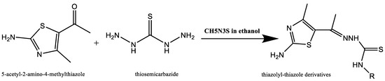By reacting 5-acetyl-2-amino-4-methylthiazole with thiocarbohydrazide (CH6N4S) and thiosemicarbazide (CH5N3S) in 100% ethanol and the presence of a catalytic quantity of concentrated HCl, as shown below, Gomha et al. [20] reported the synthesis of novel thiazolyl–thiazole derivatives depicted in Figure 7.