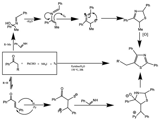 The synthesis of substituted thiazoles starting from enamines and elemental sulfur depicted in Figure 6 through to the production of carbon and sulfur bonds was described by Yan et al. [19]. Enamines are created when a secondary amine reacts with an aldehyde or ketone. They are nucleophilic because they have a substantial resonance form in which the alpha carbon carries a negative charge. Enamines interact with electrophiles such as Michael acceptors and alkyl halides to form reactions.