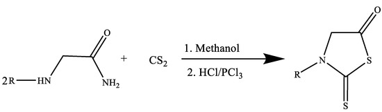 After reacting N-methylglycine amide with carbon disulfide in the presence of methanol to produce N-methyl-N-(carbamoylmethyl) ammonium N-methyl-N-(carbamoylmethyl) dithio-carbamate, 2-Thio-3-methyl-5-thiazolidinone derivatives were created. To produce the finished product (Figure 10), this dithiocarbamate was finally acidified using strong HCl or PCl3 [22]. According to reports, a wide range of reactants with the NCS fragment undergo cyclization to produce thiazolidinones when they interact with halocarbonyl compounds. According to reports, a wide range of reactants with the NCS fragment undergo cyclization to produce thiazolidinones when they interact with halocarbonyl compounds.