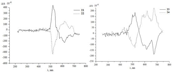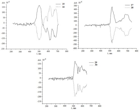 It was established that under the developed conditions (80 °C, 1 h, chlorobenzene) C60 interacts with diazoketones of the indicated amino acids (molar ratio 1:5) under the action of 20 mol.%Pd(acac)2–2PPh3–4Et3Al, selectively forming the corresponding methanoful-lerenes 21–30 with yields of 30–77%. Unfortunately, all attempts to measure the optical angles of rotation of the polarization plane of synthesized methanofullerenes with protected amino groups were unsuccessful. Therefore, for a more reliable proof of the stereochemistry of optically active methanofullerenes, we turned to the circular dichroism (CD) method [30,31]. As expected, in the CD spectra for the synthesized enantiomers 21–30, a mirror image of the cotton effects (EC) was obtained (Figure 1).