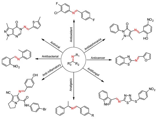 Schiff bases have shown a wide range of biological activities [7] (Scheme 1), such as antileishmanial [8], analgesic [9], anti-inflammatory [10], antioxidant [11], antiviral [12], antifungal [13], and antibacterial activities [3], and for their biological activities, the imine or azomethine group (>C=N-) seems to be crucial.