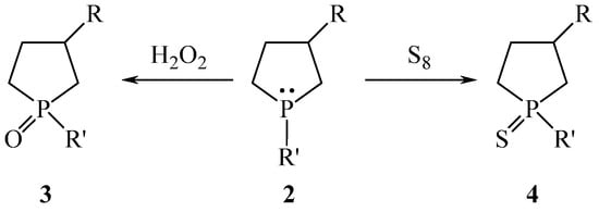 Phospholanes 2 easily react with H2O2 in chloroform due to the presence of a lone electron pair in phosphorus with quantitative yields of phospholane 1-oxides 3. The reaction of 2 with S8 leads to phospholane-1-sulfides 4 also in quantitative yields (Scheme 2).