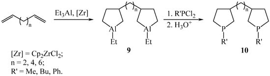 Next, we thought it expedient to apply our method to obtain α,ω-bisphospholane compounds by the interaction of phosphorus dihalides with bisaluminacyclopentanes. It was established that, under the developed conditions, bisaluminacyclopentanes 9, obtained by the catalytic cycloalumination of 1,5-hexadiene, 1,7-octadiene, and 1,9-decadiene, react with phosphorus dihalides to form bisphospholanes 10 as a mixture of isomers with a total yield of 84–85% (Scheme 4) [].