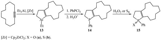 The interaction of in situ generated bicyclic organoaluminum compound 13 with PhPCl2 yielded phospholene 14 with an annelated cyclic fragment in 81% yield (Scheme 6) []. Derivatization of bicyclic phospholene 14 gave rise to 2,3-dihydrophosphol-1-oxide 15a and 2,3-dihydrophosphol-1-sulfide 15b in quantitative yields.