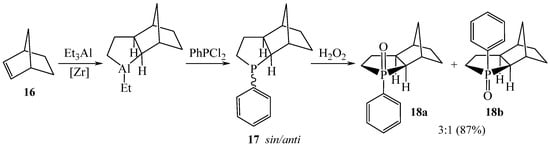 An efficient one-pot method was developed for the synthesis of polycyclic phospholane oxides 18, 20, 22, and 24 by the in situ reaction of dichlorophosphines with norbornane-annelated aluminacyclopentanes obtained by the catalytic cycloalumination of norbornenes in 81–92% yields (Scheme 7 and Scheme 8) [].