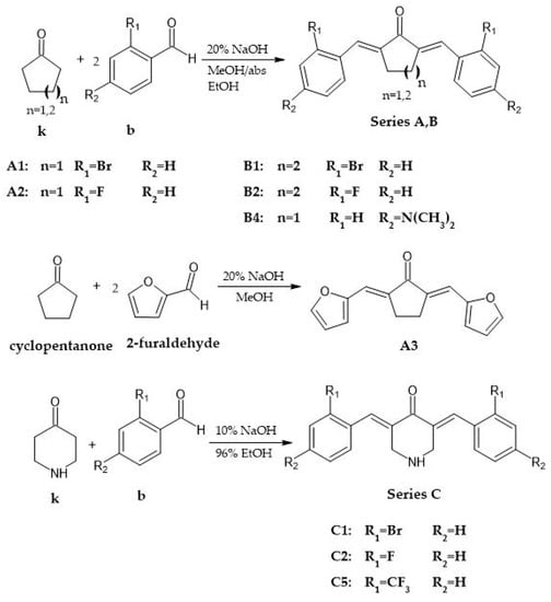 The analogs were obtained by coupling 1 eq. of the appropriate ketone with 2 eq. of the substituted benzaldehyde via the Claisen–Schmidt condensation reaction. The synthetic routes of the base catalyzed reactions are presented in Scheme 1.