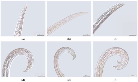 Light-microscopy micrographs of the tails of female (a–c) and male (d–f) Bursaphelenchus xylophilus (a,d), B. mucronatus (b,e) and B. fraudulentus (c,f). Bar = 20 μm.