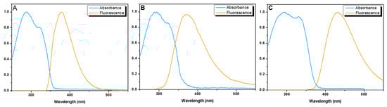 Normalized absorption and fluorescence spectra (λexc = 280 nm) of compounds 3 and 4. (A) Ligand 3 in MeCN; (B) Ligand 4 in MeCN; (C) Ligand 4 in Tris-HCl Buffer (0.1 M; pH = 7.1).