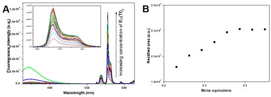 As can be seen in Figure 3A, the fluorescence emission band of the ligand 4 at 364 nm (green curve) undergoes a progressive decrease of intensity with the addition of Eu(Tf)3. Simultaneously, new bands appear at 578, 592, 614, and 652 nm, which undergo progressive intensification with the addition of Eu(Tf)3. This phenomenon indicates the formation of a Eu complex with ligand 4 and the sensitization of the Eu3+ ion fluorescence by ligand 4. The bands at 578, 592, 614, and 652 nm have a characteristic shape, dependent on the symmetry of the complex and can be attributed to transitions 5D0-7FJ (J = 0, 1, 2, 3, 4. The progressive intensification of the more intense band at 614 nm (hypersensitive transition) with the addition of Eu(Tf)3 allows estimation of the stoichiometry of the complex.