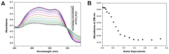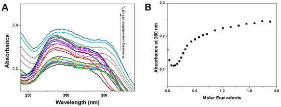 Fluorescence titrations (λexc = 280 nm) of aqueous solutions (0.1 M Tris-HCl buffer, pH = 7.1) of ligand 4 with EuCl3.6H2O revealed no change in the emission spectrum of the ligand nor the appearance of bands attributed to electronic transitions of Eu3+ ion. However, the spectrophotometric titration reveals that there is interaction between the ligand 4 and the Eu3+ ion in aqueous solution (Figure 5A).