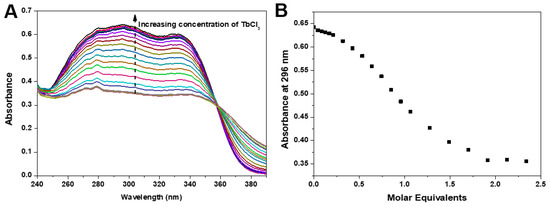 The dependence of the absorption band intensity at 296 nm on the number of molar equivalents of Tb3+ also suggests the formation in aqueous solution of a Tb(4) complex with M:L stoichiometry (1:1) (Figure 6B).